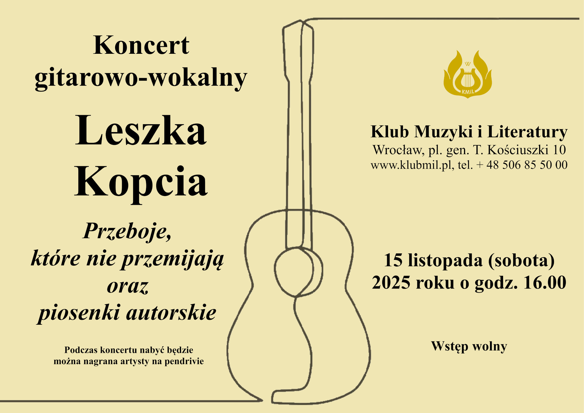 Klub Muzyki i Literatury we Wrocławiu zaprasza na koncert gitarowo-wokalny Leszka Kopcia pt. „Przeboje, które nie przemijają oraz piosenki autorskie”15 listopada (sobota) 2025 roku o godz. 16.00 Podczas koncertu nabyć będzie można nagrana artysty na pendrivie.