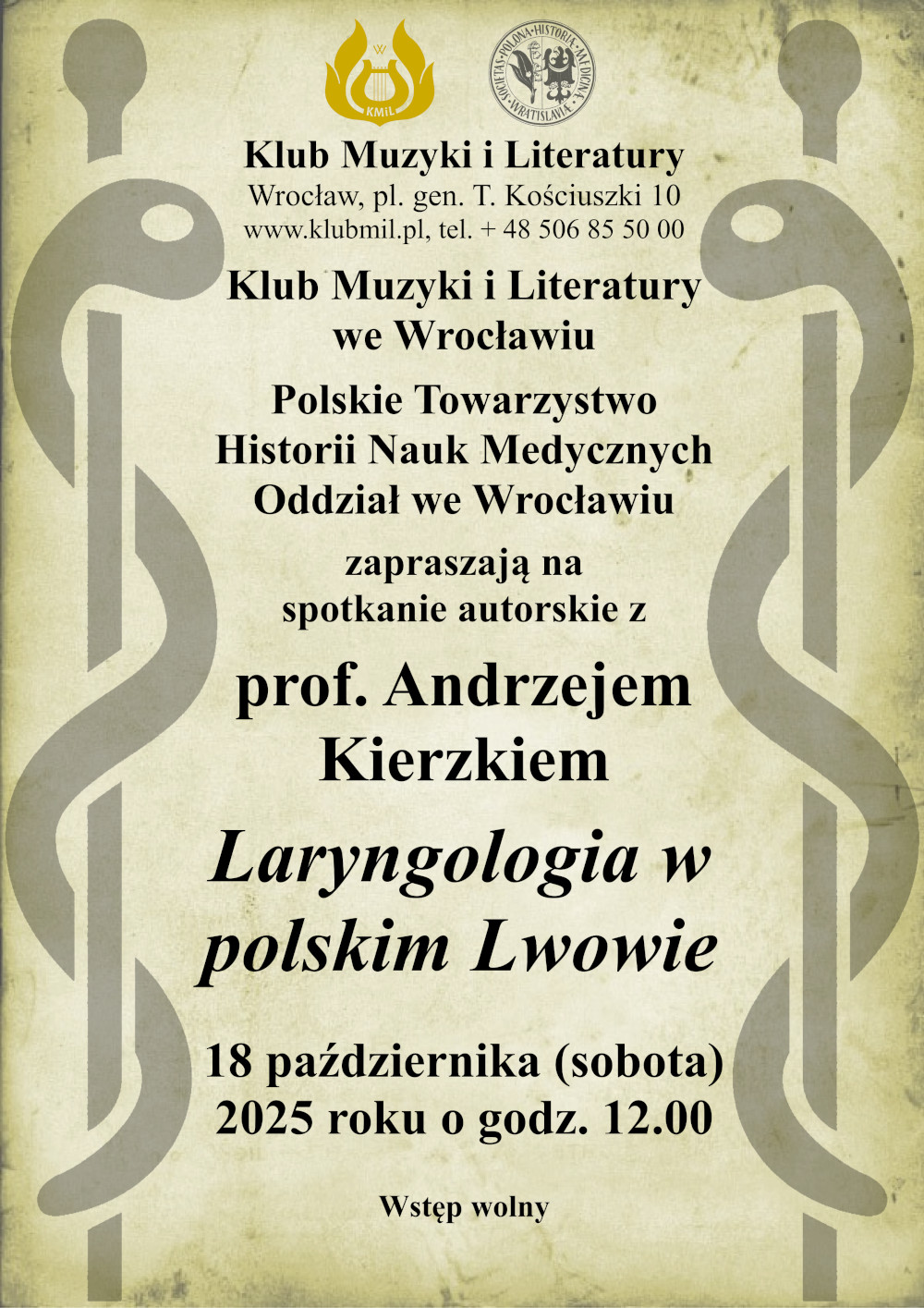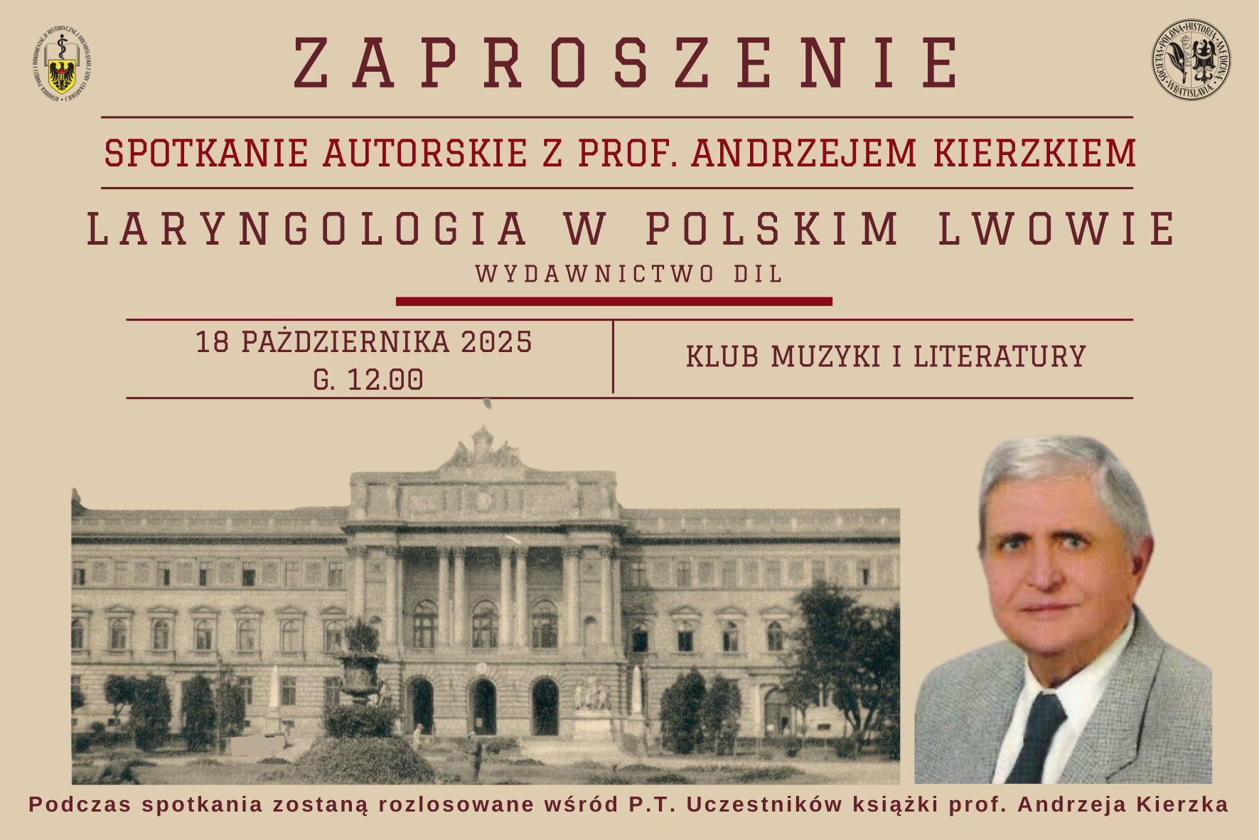 | Klub Muzyki i Literatury we Wrocławiu, Polskie Towarzystwo Historii Nauk Medycznych Oddział we Wrocławiu zapraszają na spotkanie autorskie z prof. Andrzejem Kierzkiem pt. „Laryngologia w polskim Lwowie”18 października (sobota) 2025 roku o godz. 12.00 Prof. zw. dr hab. n. med. Andrzej Kierzek – specjalista otorynolaryngolog specjalista fizjoterapeuta i balneoklimatolog, em. kierownik Zakładu Klinicznych Podstaw Fizjoterapii Uniwersytetu Medycznego we Wrocławiu, przewodniczący Sekcji Historycznej Polskiego, Towarzystwa Otorynolaryngologów – Chirurgów Głowy i Szyi, członek czynny Komisji do Badań nad Historią Nauk Medycznych Komitetu Historii Nauki 1 Techniki PAN, wiceprzewodniczący Naczelnej Komisji Rewizyjnej Naczelnej Izby Lekarskiej, członek honorowy Polskiego Towarzystwa Otorynolaryngologów-Chirurgów Głowy i Szyi, członek honorowy Polskiego Towarzystwa Historii Medycyny i Farmacji, redaktor naczelny Materiałów Naukowych Sekcji Historycznej Polskiego Towarzystwa Otorynolaryngologów – Chirurgów Głowy i Szyi, odznaczony m.in. medalem „Gloria Medicinae” odznaczeniem „Meritus pro Medicis”, honorową statuetką dra Władysława Biegańskiego, autor kilku książek oraz ponad 550 publikacji w naukowych czasopismach polskich i zagranicznych. |