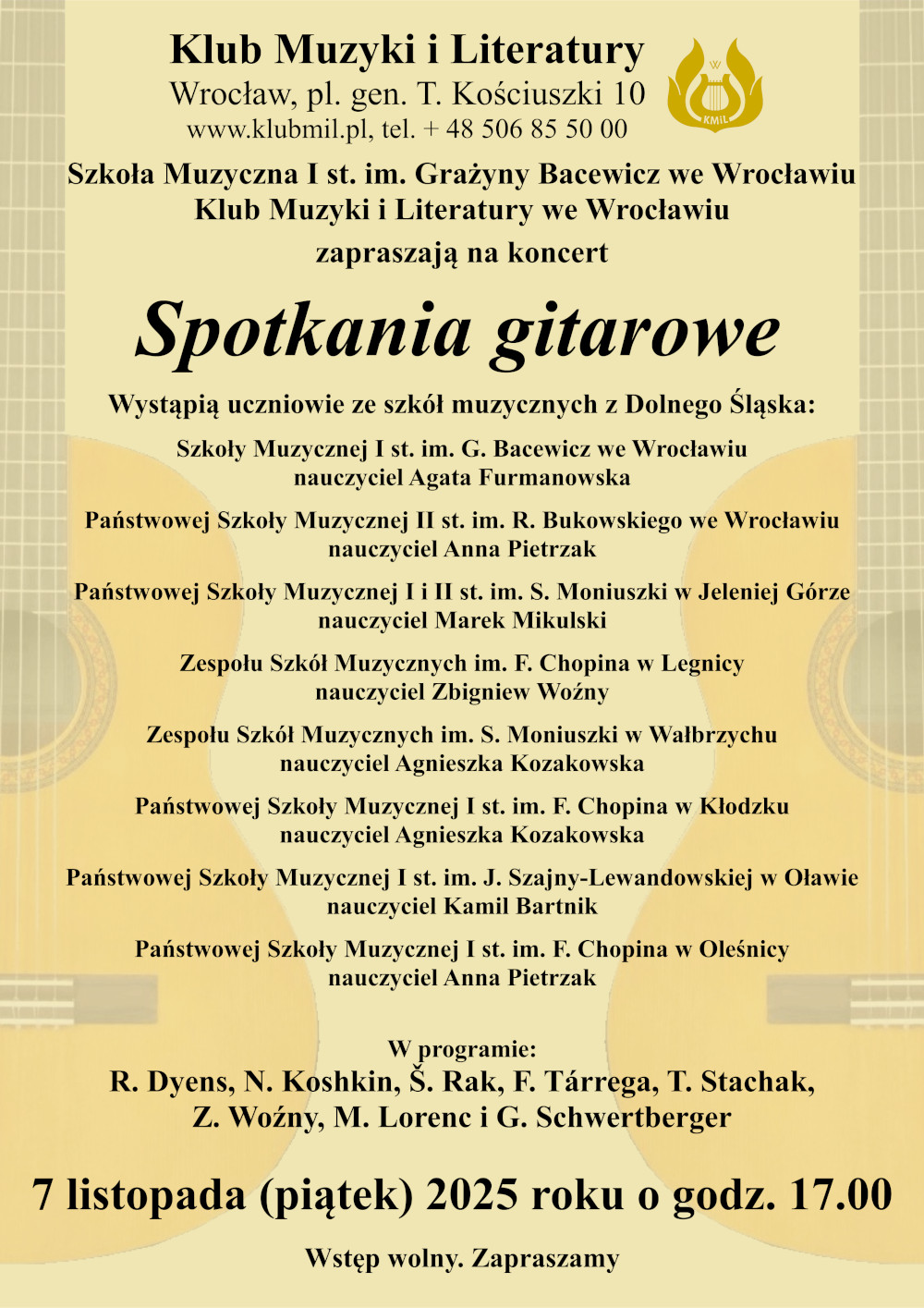 | Szkoła Muzyczna I st. im. Grażyny Bacewicz we Wrocławiu oraz Klub Muzyki i Literatury we Wrocławiu zapraszają na koncert pt. „Spotkania gitarowe”7 listopada (piątek) 2025 roku o godz. 17.00