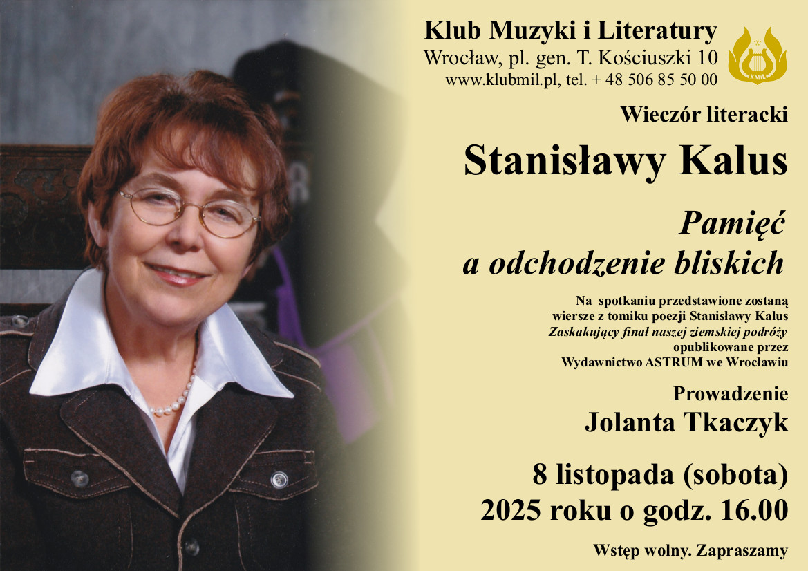 | Klub Muzyki i Literatury we Wrocławiu zaprasza na wieczór literacki Stanisławy Kalus pt. „Pamięć a odchodzenie bliskich”Prowadzenie: Jolanta Tkaczyk Na spotkaniu przedstawione zostaną wiersze z tomu poezji Stanisławy Kalus pt. Zaskakujący finał naszej ziemskiej podróży opublikowane przez Wydawnictwo ASTRUM we Wrocławiu W związku z kolejnymi Świętami Zmarłych nadszedł czas pochylenia się nad problemem odchodzenia do wieczności tak wielu ludzi. Zarówno tych, którzy byli nam tak bardzo bliscy, ale także tych, którzy stale byli nam bliscy jako ludzie niezmiernie znani i szczególnie lubiani, najwspanialsi w różnych dziedzinach życia społecznego i osobistego, w zakresie ogólnokrajowym i światowym. Problem ich umieralności jest zagadnieniem niezwykle istotnym, podejmuje się w tym zakresie różne kwestie, szuka się dróg ich rozwiązania. W związku z tym, że przeżycia związane odejściem takich osób poruszają wiele osób, to ich osiągnięcia powinny zapisywać się w pamięci ogólnej społeczeństwa. Zagadnienia te powinny być stale dla nas bardzo istotne, bo ciągle doświadczamy tak wielu problemów prowadzących do wzrostu liczby zgonów z powodu pandemii, wojen, czy zmian społecznych i politycznych. Istotne więc wydaje się zastanowienie się nad tym, jak można poprzez pamięć o zmarłych zmniejszyć skutki związane z niepogodzeniem się z ich utratą. Stanisława Kalus – profesor nauk prawnych i sędzia Sądu Apelacyjnego w Katowicach w stanie spoczynku. Ukończyła studia prawnicze na Wydziale Prawa i Administracji Uniwersytetu Jagiellońskiego w Krakowie w 1965 roku. Po studiach uczestniczyła także w tworzeniu Uniwersytetu Śląskiego w Katowicach i podjęła w nim pracę do końca swej kariery zawodowej w Katedrze Prawa Cywilnego i Prawa Prywatnego Międzynarodowego. W 1974 roku uzyskała w tym Uniwersytecie stopień naukowy doktora prawa. W 1989 roku na podstawie swojego dorobku w postaci monografii i licznych artykułów naukowych uzyskała stopień doktora habilitowanego nauk prawnych. W 2004 roku Prezydent Polski nadał jej tytuł naukowy profesora. Wychowała dwa pokolenia prawników śląskich, w tym wielu zdobyło swoje stopnie i tytuły naukowe. Poezję uprawia od wczesnej młodości, nie publikując większej liczby swoich wierszy. Dopiero w 2011 roku ukazał się w Krakowie w Wydawnictwie Słowaków tomik Okruchy. Ponieważ koledzy ze studiów pamiętali jej próby poetyckie, doprowadzili do upowszechnienia i do przedstawienia ich w wieczorach literackich w Krakowie. Ukazały się tam jeszcze cztery tomiki wraz z obszernym omówieniem wierszy w tomie Moje inspiracje. Po tym rozpoczęła się jej działalność poetycka we Wrocławiu, gdzie Wydawnictwo ASTRUM wydało jej kolejne 6 tomików. Obecnie studiuje na Uniwersytecie Trzeciego Wieku Uniwersytetu Wrocławskiego oraz wykłada tam przedmiot „Poezja w życiu człowieka starszego”. |