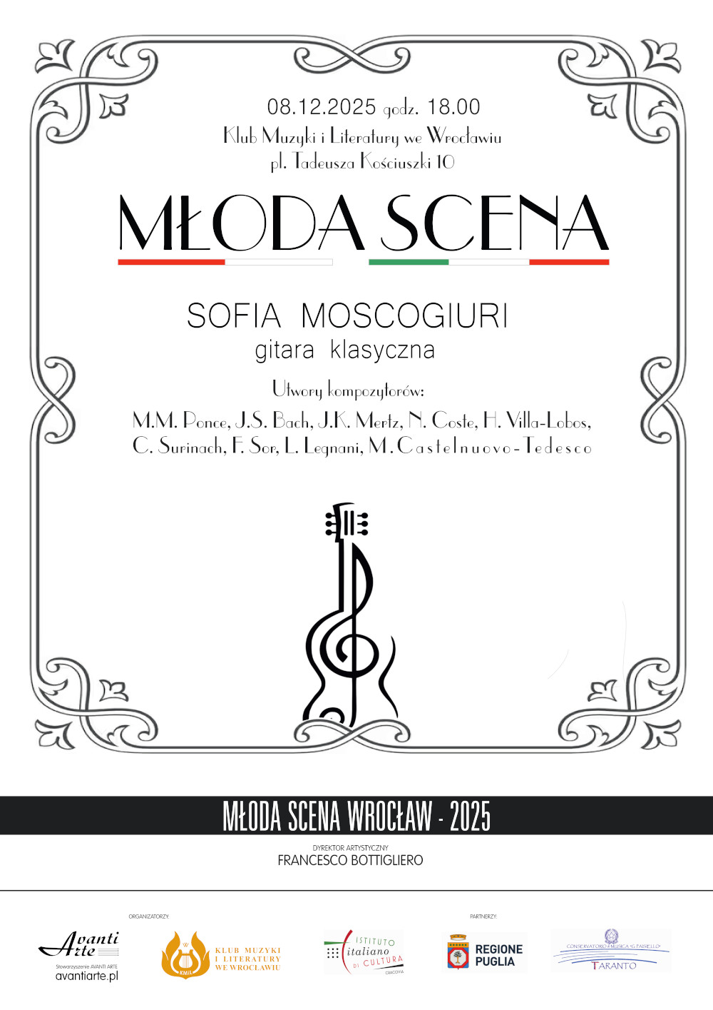 | Klub Muzyki i Literatury we Wrocławiu, Stowarzyszenie Avanti Arte oraz Istituto Italiano di Cultura zapraszają na koncert pt. „Młoda Scena”Sofia Moscogiuri – gitara klasyczna W programie: M.M. Ponce, J.S. Bach, J.K. Mertz, N. Coste, H. Villa-Lobos, C. Surinach, F. Sor, L. Legnani, M. Castelnuovo-Tedesco „Młoda Scena” to cykl koncertów zaplanowanych we Wrocławiu, podczas których młodzi, utalentowani muzycy z włoskich oraz polskich akademii muzycznych zaprezentują swój talent i umiejętności. Wydarzenie jest doskonałą okazją do zetknięcia się z różnorodnością stylów muzyki poważnej, kreatywnością i świeżym spojrzeniem młodego pokolenia artystów. Nasze cele to promocja i wspieranie młodych talentów, a także budowanie współpracy międzynarodowej i kreowanie dialogu kulturowego oraz łączenie tradycji muzycznych dwóch krajów w unikalnych wykonaniach. Repertuar koncertów obejmuje: klasyczne dzieła światowych kompozytorów, współczesne utwory, improwizacje muzyczne oraz wspólne występy artystów polskich i włoskich. Organizatorami wydarzenia są Stowarzyszenie Avanti Arte oraz Klub Muzyki i Literatury we Wrocławiu. Podziękowania należą się naszym Partnerom: Włoskiemu Instytutowi Kultury w Krakowie, Regione Puglia oraz Conservatorio di Musica G. Paisiello w Taranto za zaufanie i wspieranie naszego projektu. Sofia Moscogiuri – uczy się gry na gitarze klasycznej od szóstego roku życia. Obecnie uczęszcza na studia licencjackie w klasie Domenico Famà w Konserwatorium „Paisiello” w Tarencie. Ma na swoim koncie liczne nagrody w konkursach we Włoszech i za granicą. Wśród najnowszych wyróżnień znajdują się: I nagroda w Międzynarodowym Konkursie „Peraldo Bert” w Akademii Perosi w Bielli oraz II nagroda w Krajowym Konkursie Gitarowym „Ansaldi” w Pamparato (CN). Do wcześniejszych osiągnięć należą m.in. II miejsce w Międzynarodowym Konkursie Gitarowym KTTNB 2020 w Rydze (Łotwa), I nagroda absolutna w konkursie Domenico Savino w Tarencie. W ostatnim czasie występowała m.in. w Fundacji „Paolo Grassi” w Martina Franca, w Klubie Oficerów w Tarencie (na zaproszenie Soroptimist Club Taranto, podczas „Koncertu Wiosennego”) oraz podczas Lacrima Wine Festival w Morro d'Alba (AN). Wśród ważnych koncertów warto wymienić także występ w Circolo Unione di Bari, w prestiżowej Sali Muz (Salone delle Muse), w Rapallo (GE) w Oratorium dei Neri oraz w Perugii w Sali dei Notari. Strona Stowarzyszenia Avanti Arte: www.avantiarte.pl |