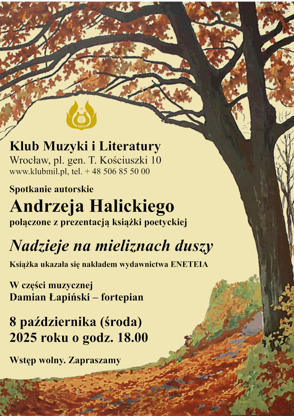 Klub Muzyki i Literatury we Wrocławiu zaprasza na spotkanie autorskie Andrzeja Halickiego połączone z prezentacją książki poetyckiej pt. „Nadzieje na mieliznach duszy”W części muzycznej: Damian Łapiński – fortepian Andrzej Halicki, „Nadzieje na mieliznach duszy” (okładka) [pdf] Książka ukazała się nakładem wydawnictwa ENETEIA Prawo, nauka i poezja to nietypowa kompozycja. Prawo kojarzy się z działaniem w sztywnych ramach, ścisłym przestrzeganiem reguł. Poezja tymczasem wychodzi poza schematy, jej domeną jest różnorodność, wielość, kreatywność. Łączy myśl i wyobraźnię z wieloma sprawami. Łamie kanony, za nic ma przepisy, nie podporządkowuje się sądom, drwi z urzędowych ustaw. I w takim otoczeniu powstały te wiersze. Spragnione delikatności, a przy tym nieobojętne na krzywdę i nieczułość. Ten zbiór to świadectwo nadziei, że można inaczej, mniej idealnie, niedoskonale. To próba słów nieocenzurowanych na chwilę przed premierą. Miłość, czułość, przemijanie niecierpliwie czekają na swoje drugie życie. Czekają, mimo że już wszystko przeżyły. Autor Andrzej Halicki – poeta, społecznik, doktor nauk prawnych, wykładowca akademicki. Absolwent zarządzania i prawa Uniwersytetu Wrocławskiego. Autor kilkunastu książek oraz ponad 100 publikacji w czasopismach naukowych. Specjalizuje się w prawie petycji oraz prawie dostępu do informacji publicznej. Zaangażowany w działania edukacyjne na rzecz rozwoju społeczeństwa obywatelskiego. Autor pięciu książek poetyckich: Miłość i inne przypadki, Westchnienie, Ludzie bezcelowi, Między ciszą i milczeniem, Nadzieje na mieliznach duszy. Laureat ogólnopolskich konkursów literackich m.in. w Ostrołęce, Suwałkach, Krasnymstawie, Łochowie, Kłobucku. Jest przewodniczącym jury ogólnopolskiego konkursu poetyckiego „O Złoto Topoli” w Wisznicach. W swoich wierszach poszukuje prostoty przekazu, stawiając na wrażliwość, czułość odbiorcy. Jego poezja potrafi zaskakiwać czytelnika, nie dając gotowej odpowiedzi, lecz skłaniając do refleksji nad przemijaniem, nadzieją, tęsknotą. Często sięga do krótkich form poetyckich, ujęcia w kilku słowach tego, co ulotne, rzadko dostrzegalne. Damian Łapiński – uczeń Ogólnokształcącej Szkoły Muzycznej I i II stopnia im. K. Szymanowskiego we Wrocławiu w klasie fortepianu K. Kaczorowskiej. Jest laureatem konkursów ogólnopolskich i międzynarodowych. W latach 2022–2024 otrzymał stypendium Prezydenta Wrocławia w zakresie twórczości i edukacji artystycznej. Rozwija umiejętności również w zakresie śpiewu i tańca – jest uczniem Młodzieżowej Akademii Musicalowej. Od października 2022 roku występuje w Teatrze Muzycznym Capitol we Wrocławiu – wciela się w rolę Benjiego w spektaklu Priscilla Królowa Pustyni. Musical. W 2023 roku wziął udział w spektaklu Chopin 44 – Musical Narodowy, finansowanym ze środków Kancelarii Prezesa Rady Ministrów. |