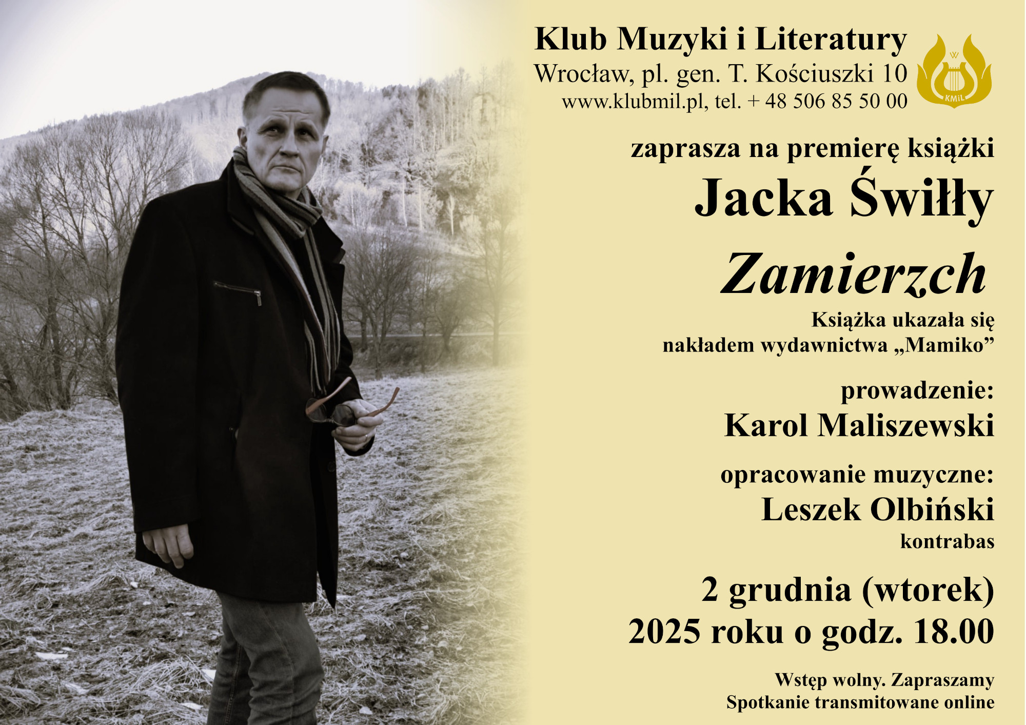 | Klub Muzyki i Literatury we Wrocławiu zaprasza na premierę książki Jacka Świłły pt. „Zamierzch”prowadzenie: Karol Maliszewskiopracowanie muzyczne: Leszek Olbiński – kontrabas