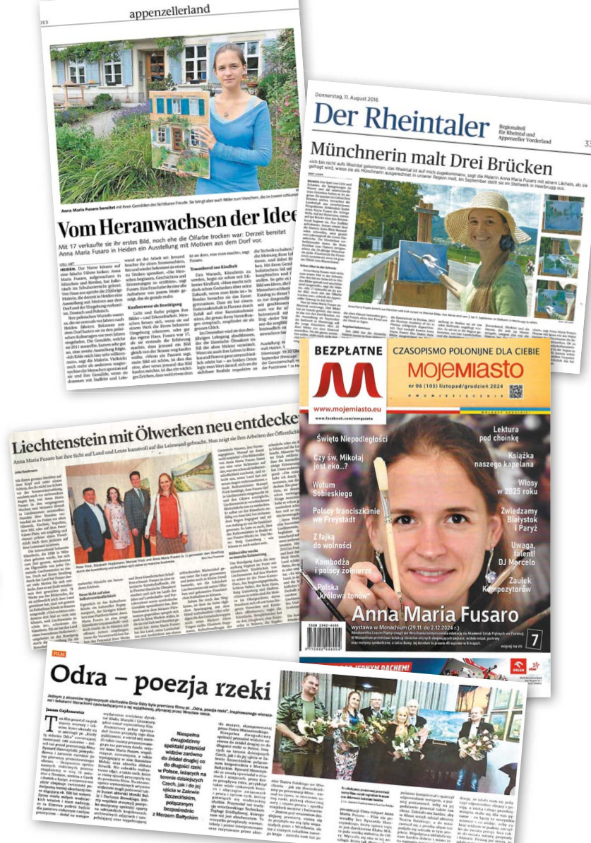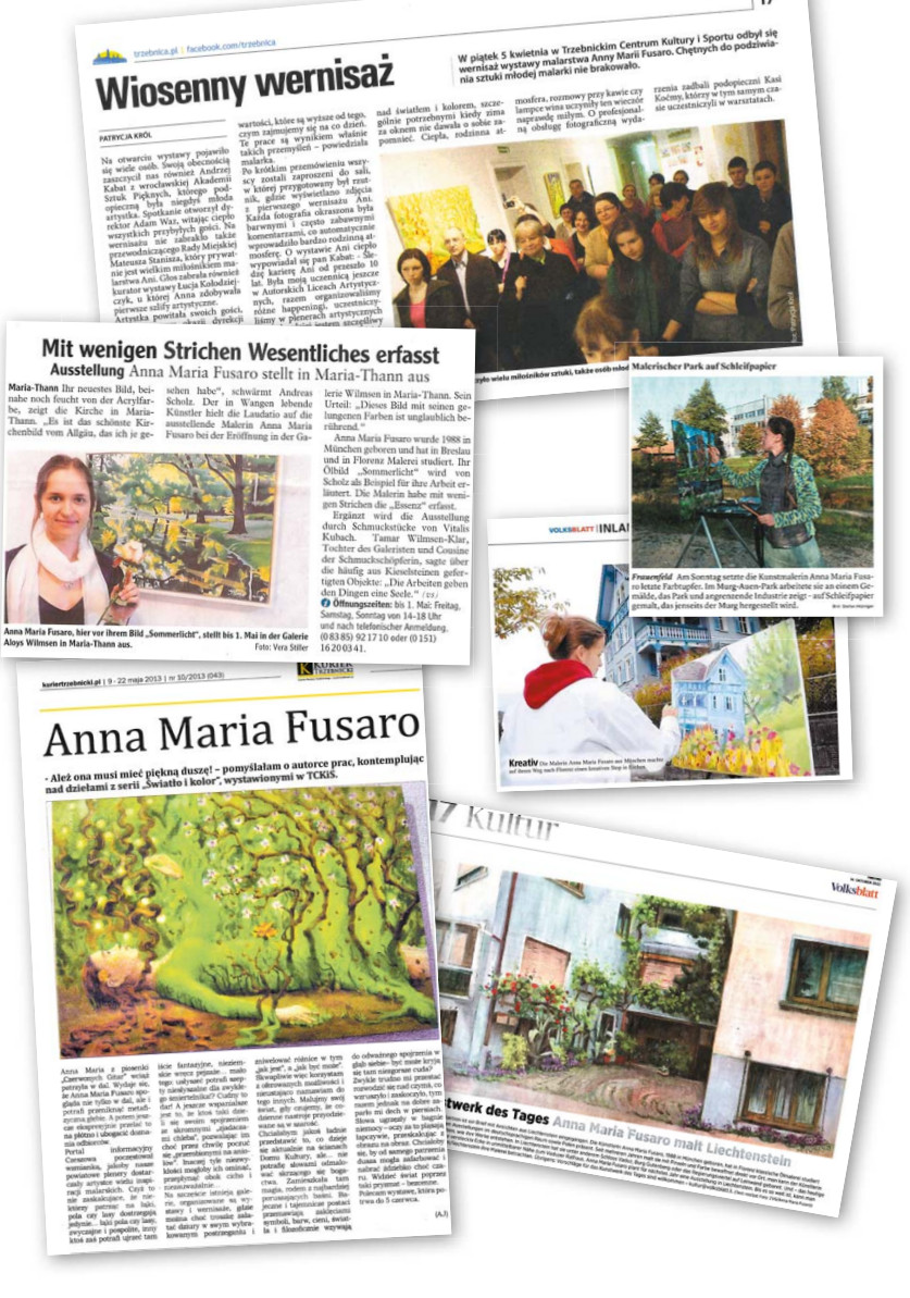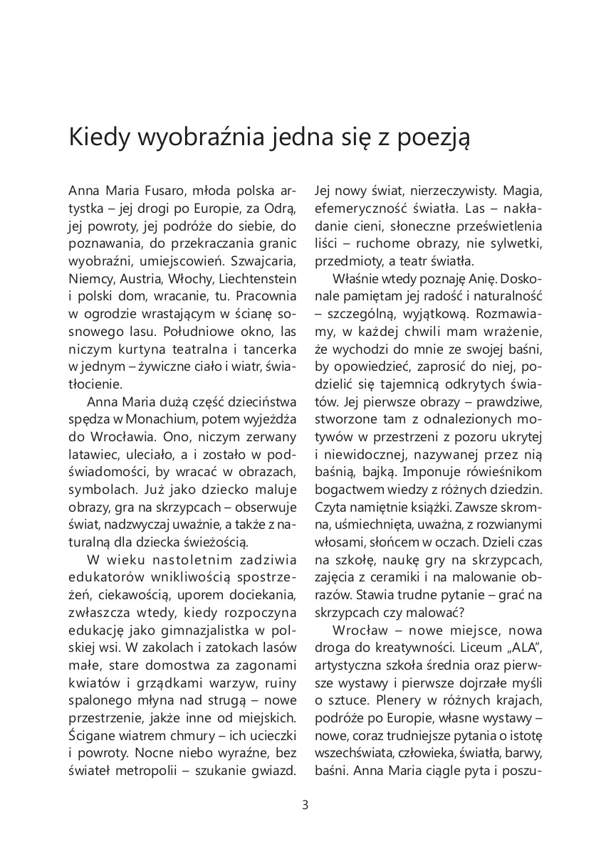 Przed osiemnastoma laty w Klubie „U Artystów” w moim rodzinnym Olsztynie Anna Maria Fusaro pokazała pierwszą w swojej karierze wystawę indywidualną, zatytułowaną Mój świat. Miałem zaszczyt zapoznać młodziutką malarkę z tamtejszym środowiskiem artystycznym, które entuzjastycznie przyjęło myśl zaprezentowania jej prac w jednej z lubianych galerii stolicy Warmii i Mazur. Mój świat okazał się ciepły i przyjazny, a podróż do niego, którą umożliwiła olsztyńska wystawa, zapisała się w miłej pamięci wszystkich ją odwiedzających. Wernisaż zgromadził wielu ważnych i ciekawych ludzi, przybyli m.in. ówcześni członek Zarządu Województwa, przewodnicząca komisji kultury Rady Miasta, malarze i autorzy z Olsztyna. Sama Anna Maria Fusaro wobec nich omawiała zaskakująco dojrzale swoje refleksje na temat światła. Ich ucieleśnieniem stały się maleńkie świeczki, które jako symbol „swego świata” rozdała obecnym na otwarciu swojej pierwszej ekspozycji.