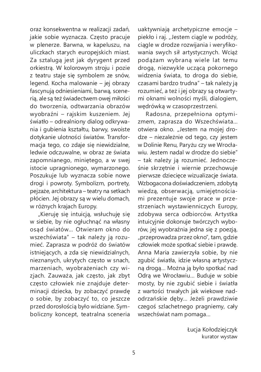 Radosna, przepełniona optymizmem, zaprasza do Wszechświata… otwiera okno. „Jestem na mojej drodze – niezależnie od tego, czy jestem w Dolinie Renu, Paryżu czy we Wrocławiu. Jestem nadal w drodze do siebie” – tak należy ją rozumieć. Jednocześnie skrzętnie i wiernie przechowuje pierwsze dziecięce wizualizacje świata. Wzbogacona doświadczeniem, zdobytą wiedzą, obserwacją, umiejętnościami prezentuje swoje prace w przestrzeniach wystawienniczych Europy, zdobywa serca odbiorców. Artystka intuicyjnie dokonuje twórczych wyborów, jej wyobraźnia jedna się z poezją, „przeprowadza przez okno”, tam, gdzie człowiek może spotkać siebie i prawdę. Anna Maria zawierzyła sobie, by nie zgubić światła, idzie własną artystyczną drogą… Można ją było spotkać nad Odrą we Wrocławiu… Buduje w sobie mosty, by nie zgubić siebie i światła z wartości trwałych jak wiekowe nadodrzańskie dęby… Jeżeli prawdziwie czegoś szlachetnego pragniemy, cały wszechświat nam pomaga…
