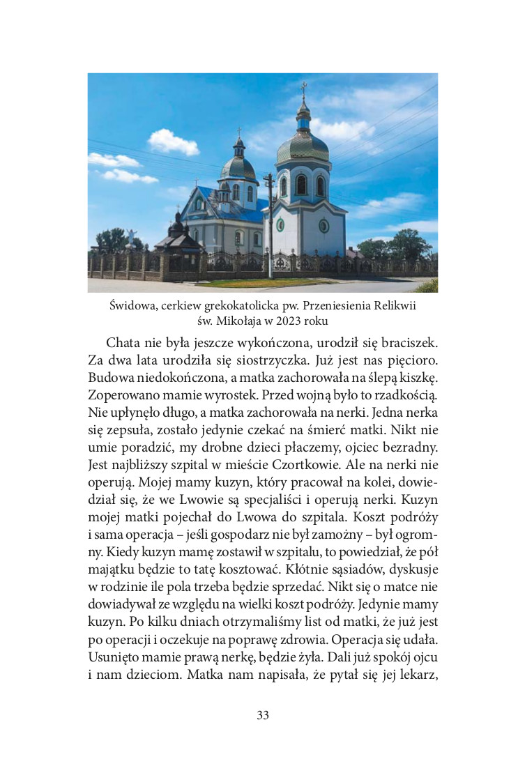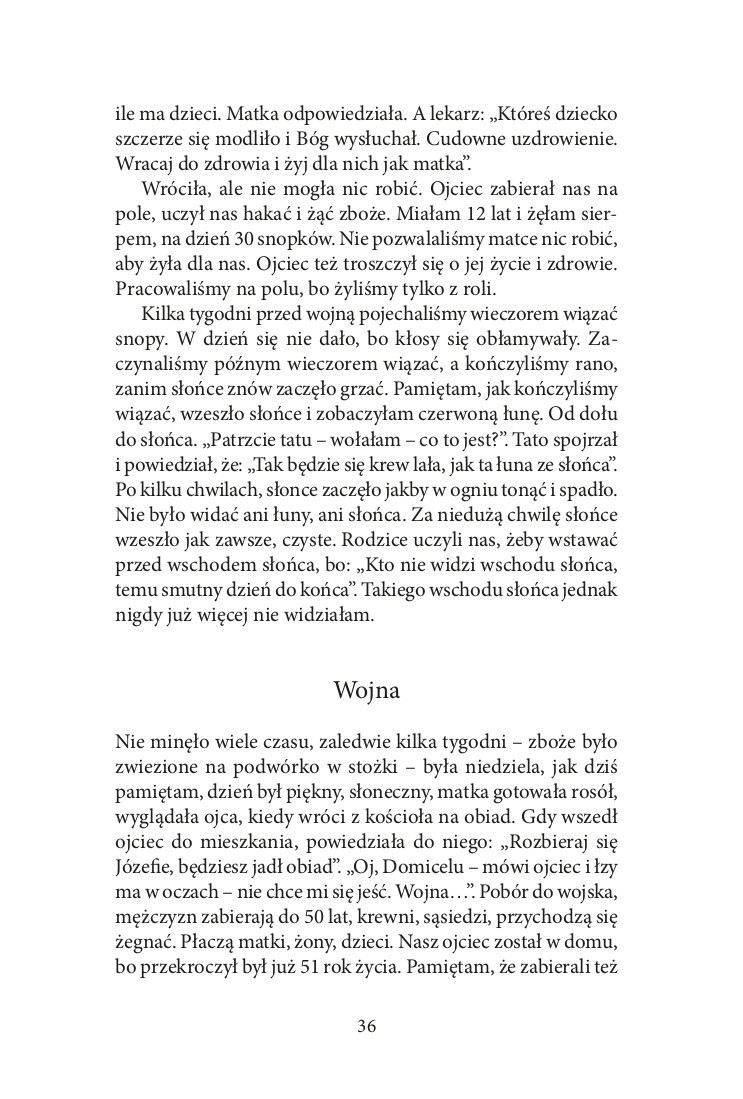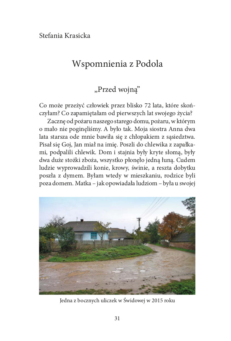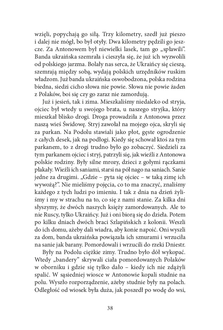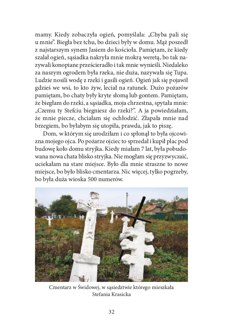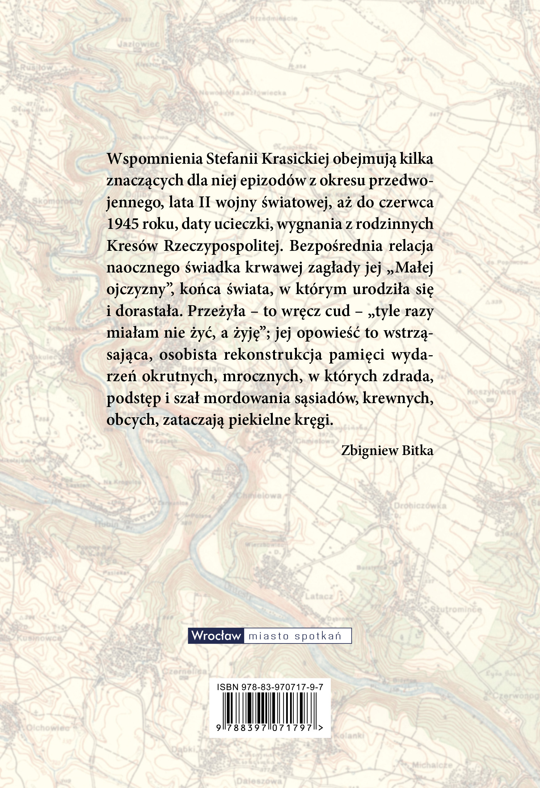 Wspomnienia Stefanii Krasickiej obejmują kilka znaczących dla niej epizodów z okresu przedwojennego, lata II wojny światowej, aż do czerwca 1945 roku, daty ucieczki, wygnania z rodzinnych Kresów Rzeczypospolitej. Bezpośrednia relacja naocznego świadka krwawej zagłady jej „Małej ojczyzny”, końca świata, w którym urodziła się i dorastała. Przeżyła – to wręcz cud – „tyle razy miałam nie żyć, a żyję”; jej opowieść to wstrząsająca, osobista rekonstrukcja pamięci wydarzeń okrutnych, mrocznych, w których zdrada, podstęp i szał mordowania sąsiadów, krewnych, obcych, zataczają piekielne kręgi.