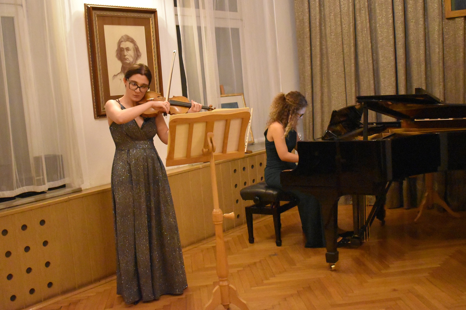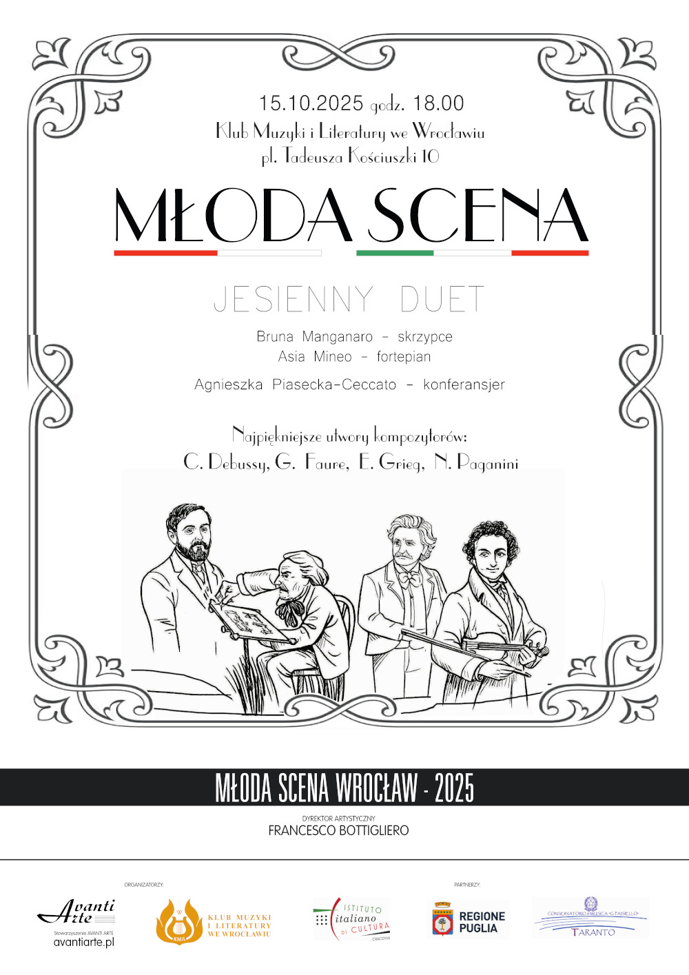 Bruna Manganaro – skrzypce W programie: C. Debussy, G. Fauré, E. Grieg, N. Paganini „Młoda Scena” to cykl koncertów zaplanowanych we Wrocławiu, podczas których młodzi, utalentowani muzycy z włoskich oraz polskich akademii muzycznych zaprezentują swój talent i umiejętności. Wydarzenie jest doskonałą okazją do zetknięcia się z różnorodnością stylów muzyki poważnej, kreatywnością i świeżym spojrzeniem młodego pokolenia artystów. Nasze cele to promocja i wspieranie młodych talentów, a także budowanie współpracy międzynarodowej i kreowanie dialogu kulturowego oraz łączenie tradycji muzycznych dwóch krajów w unikalnych wykonaniach. Repertuar koncertów obejmuje: klasyczne dzieła światowych kompozytorów, współczesne utwory, improwizacje muzyczne oraz wspólne występy artystów polskich i włoskich. Organizatorami wydarzenia są Stowarzyszenie Avanti Arte oraz Klub Muzyki i Literatury we Wrocławiu. Podziękowania należą się naszym Partnerom: Włoskiemu Instytutowi Kultury w Krakowie, Regione Puglia oraz Conservatorio di Musica G. Paisiello w Taranto za zaufanie i wspieranie naszego projektu. Bruna Manganaro – rozpoczęła naukę gry na skrzypcach w bardzo młodym wieku, mając zaledwie cztery lata pod kierunkiem Didi Tartari i Petrita Dervishja. W wieku ośmiu lat została przyjęta do Konserwatorium „Giovanni Palsiello” w Tarencie, gdzie kształciła się najpierw u Fablo Cafaro, a następnie u Silvana D'Andrii. Kontynuowała studia w Konserwatorium „Nino Rota” w Monopoli pod kierunkiem Francesco Comisso i Daniele Orlando, a dyplom uzyskała z najwyższą oceną i wyróżnieniem cum laude w klasie Ilaria Cusano. Obecnie uczęszcza na studia magisterskie II stopnia w zakresie gry na skrzypcach w Konserwatorium „Giovanni Paisiello” w Tarencie w klasie Marii Rosarii D'Aprile. Jednocześnie kształci się w Accademia Internazionale Musicale, uczestnicząc w kursach mistrzowskich prowadzonych przez Marco Fiorentiniego. Uczestniczyła również w kursach mistrzowskich i zajęciach doskonalących z takimi pedagogami jak: Francesca Dego, Carmelo Andriani, Cristiano Rossi, Francesco Comisso, Olga Doronina i Gabriele Ceci. Jest laureatką licznych pierwszych nagród i nagród absolutnych w konkursach krajowych i międzynarodowych. Występowała już zarówno jako solistka, jak i solistka z towarzyszeniem orkiestry, Gra na skrzypcach Giuseppe Arré z 2010 roku. Asia Mineo – rozpoczęła naukę gry na fortepianie w wieku siedmiu lat. Trzy lata później została przyjęta do Konserwatorium „Giovanni Paisiello” w Tarencie, gdzie początkowo kształciła się pod kierunkiem Paoli Di Somma, a następnie uzyskała Dyplom Akademicki I stopnia najwyższą oceną i wyróżnieniem cum laude w klasie Aidy Caroli. Uczestniczyła w licznych kursach m.in. prowadzonych przez Flavia Manganaro w Borgo, Alberto Miodiniego w Bardonecchii, a także w kursach muzyki kameralnej z Laurą Petrocini i Marco Fiorentinim w Narni. Jest laureatką wielu nagród w konkursach pianistycznych o randze krajowej i międzynarodowej. Występowała zarówno jako solistka, jak i w zespołach kameralnych, zdobywając m.in. pierwszą nagrodę absolutną jako solistka w Maruggio, pierwszą nagrodę absolutną w duecie kameralnym w Lecce oraz pierwszą nagrodę absolutną w duecie fortepianowym w Tarencle. Koncertowała w wielu miastach włoskich, takich jak: Grottaglie, Corigliano Calabro, Taranto, Bolzano, Narni, Martina Franca czy Rzym. We wrześniu 2022 roku została wybrana do grona 18 najlepszych pianistów włoskich konserwatoriów, reprezentując Konserwatorium w Tarencie na Premio delle Arti. We wrześniu 2024 wystąpiła w Palazzo Baronale w Castellaneta (TA). Obecnie jest studentką studiów II stopnia w klasie fortepianu oraz muzyki kameralnej w Konserwatorium „Giovanni Paisiello” w Tarencie. Po nauce muzyki kameralnej u maestro Luki Colardo kontynuuje obecnie kształcenie pod kierunkiem Barbary Panzarelli. Uczestniczy także w kursach mistrzowskich w Accademia internazionale Musicale w Rzymie, prowadzonych przez Marco Fiorentiniego i Laurę Pietrocini.