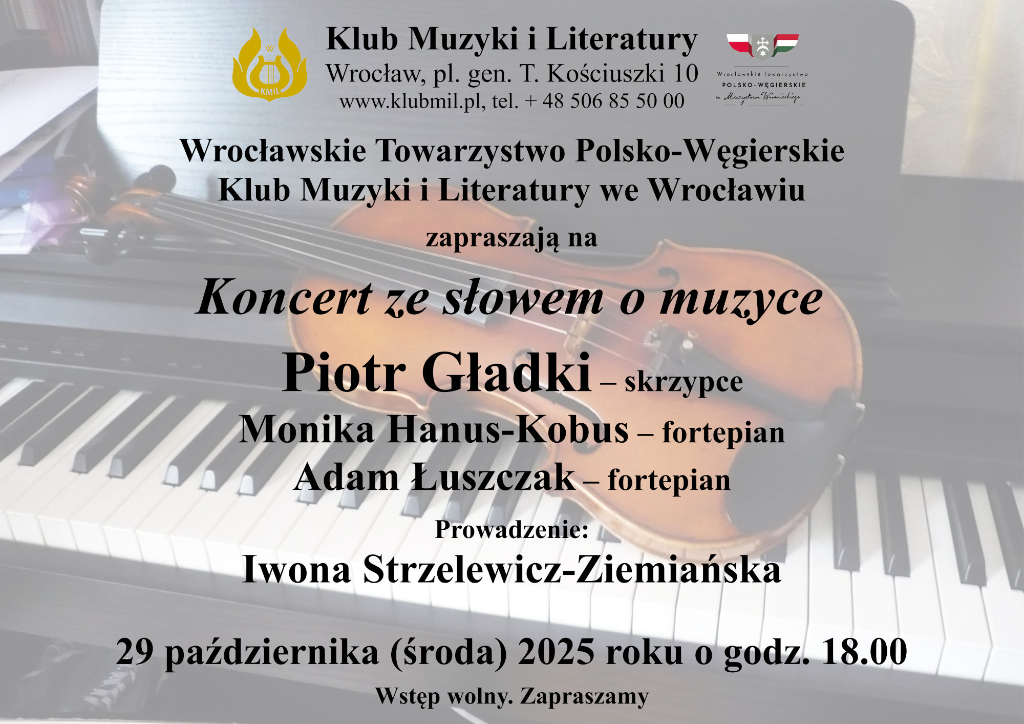 | Wrocławskie Towarzystwo Polsko-Węgierskie, Klub Muzyki i Literatury we Wrocławiu zapraszają na koncert ze słowem o muzyce
